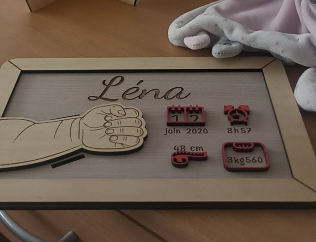 On y retrouve tous les détails de sa naissance : prénom gravé, date exacte, heure, taille, poids… et un emplacement spécial pour y glisser son petit bracelet de maternité.